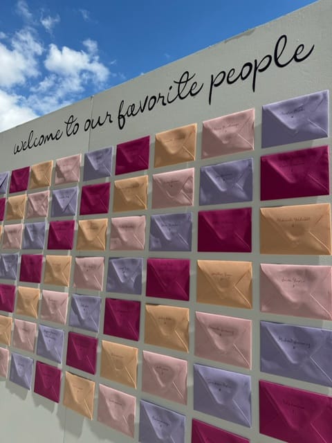 Shortly after, guests walked to the garden to find their seating for the reception. To everyone’s delight, there was a freestanding wall with brightly colored envelopes decorating the surface. Names and table numbers were placed on the exterior of each envelope and inside a heartfelt letter written to each guest –all 240 of them.