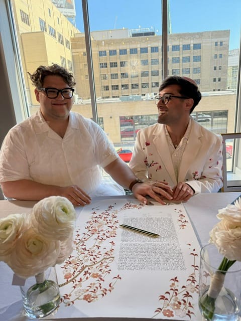 I was at Gideon’s bris, bar mitzvah, and every play he performed in from high school to the University of Michigan. And on the evening of Sunday, August 31, I watched as Gideon walked down the aisle to marry the love of his life, Jacob Rosenblum.