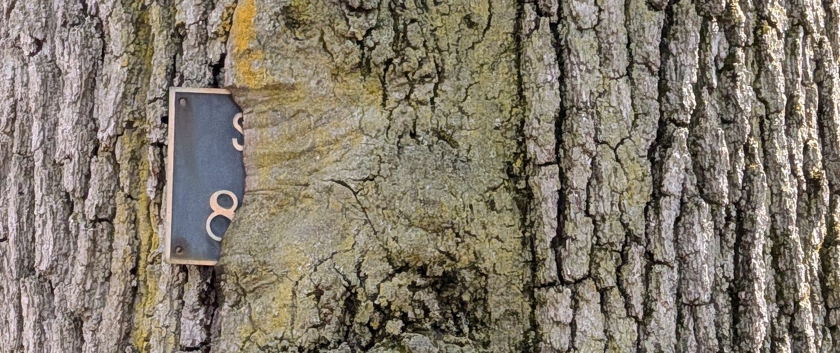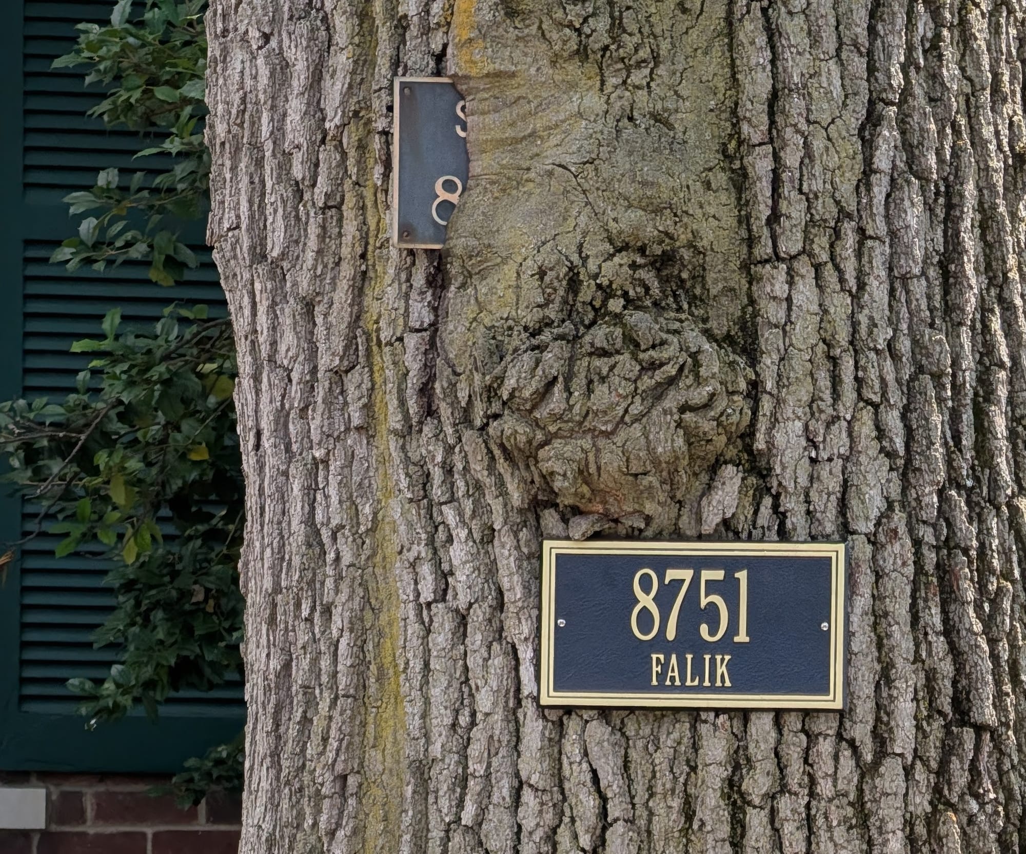 The oak trees tower. The one in the front yard must have seemed suitable back in 1956 when Simie and Ellie affixed the street number to it. Over the ensuing decades the tree paid that plaque little heed. Now all that’s visible is the S and an 8, the rest of the name and address encased beneath its bark.
