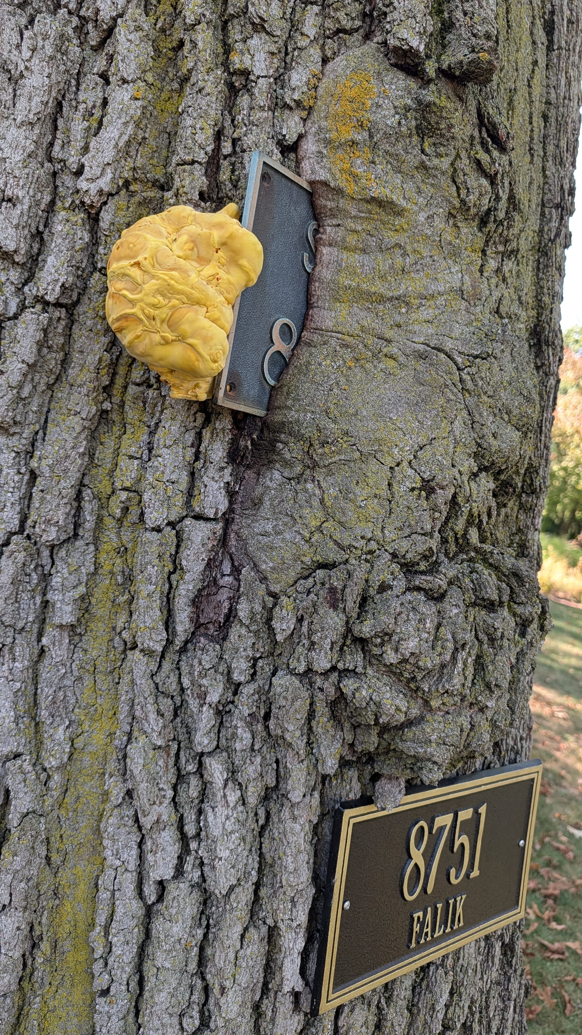I carefully removed the grapefruit-sized Laetiporus specimen from the trunk of the tree. Upon closer inspection, it matched the online description and bore none of the markings of Inonotus Dryadeus or Weeping Polypore, which can be a fatal for oak trees.