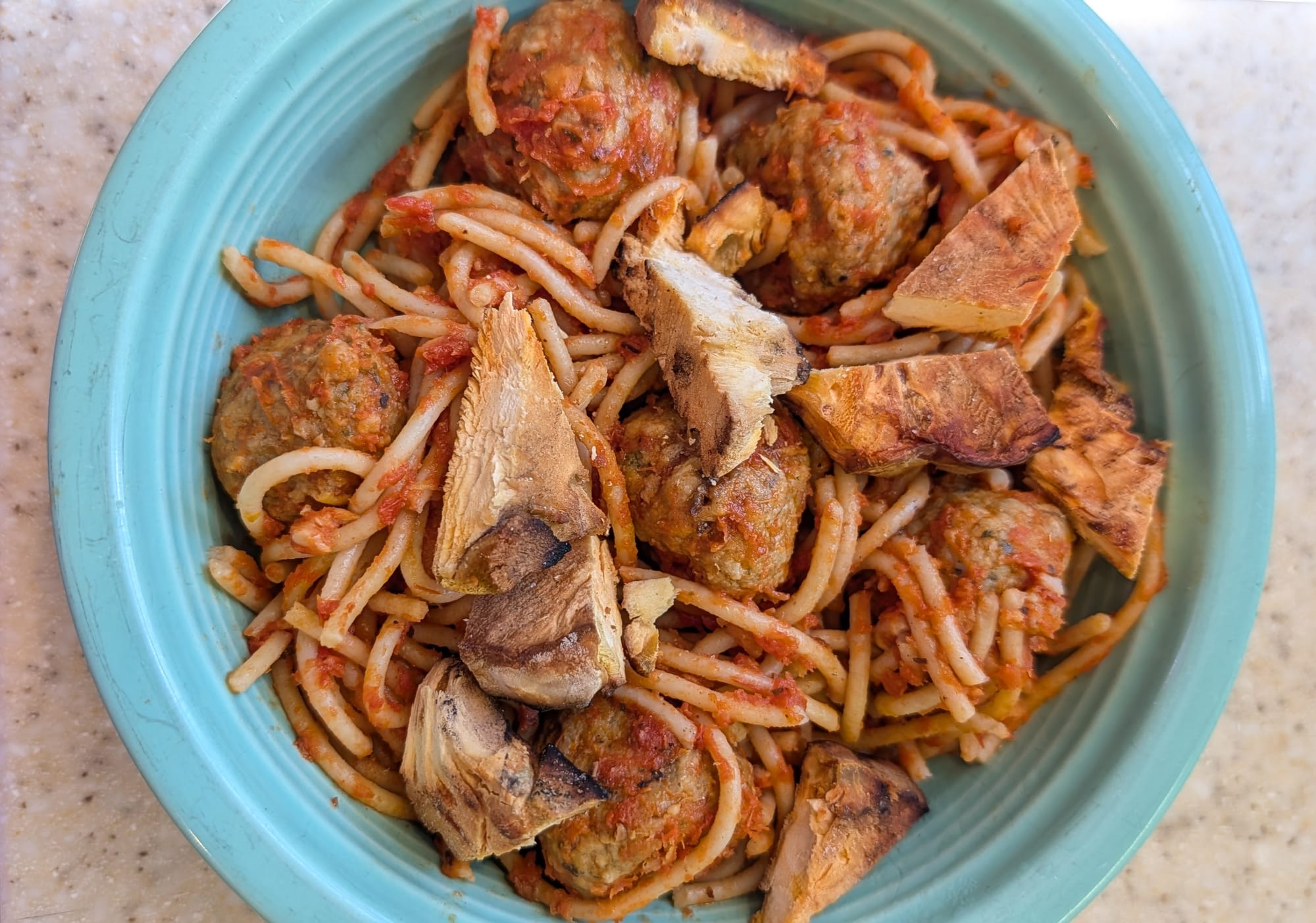 As the name suggests, Chicken of the Woods allegedly tastes like chicken. I thought it tasted more like woods. I cut a half-inch slice and sauteed it in a cast iron skillet with butter and sea salt. Alone, it was not particularly palatable, but diced in spaghetti with chicken (of the egg) meatballs, it blended nicely.