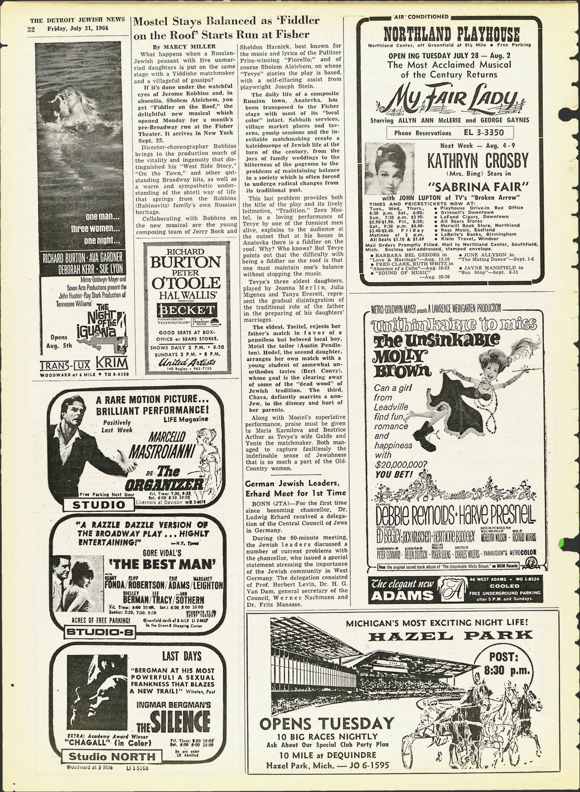 Fiddler on the Roof was, in a way, born on West Grand Boulevard in August 1964. The play’s very first test run was at the Fisher Theatre and, initially, writers Jerry Bock and Sheldon Harnick felt the play needed serious tinkering before taking the show to New York. Jerry used to tell the story of how he took a walk down Woodward and decided he needed a new song for Tevye. Right there, he began writing “If I Were a Rich Man.”