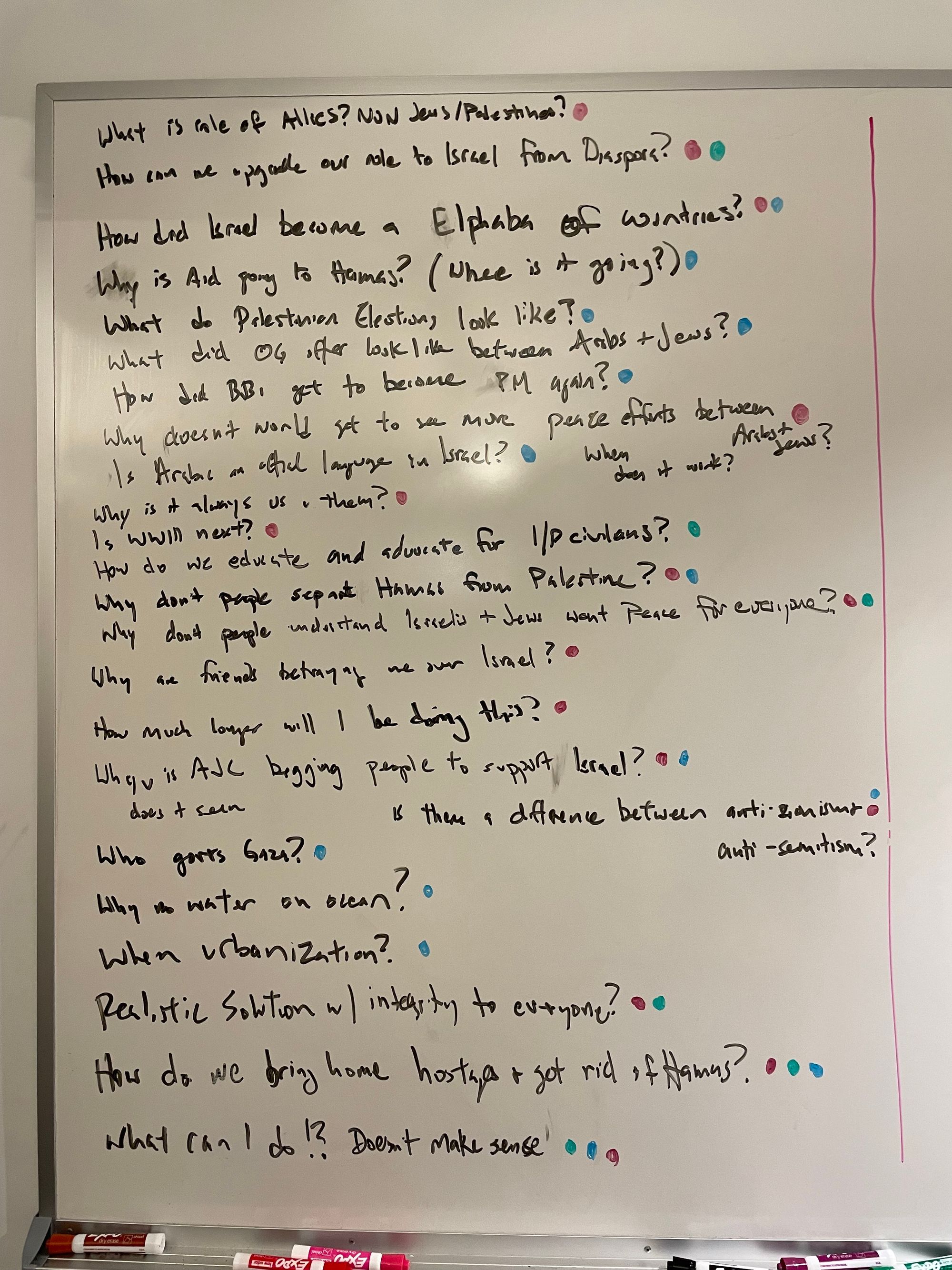 Below you will find a list of the questions, separated by category but not listed in any particular order within that, to get a real sense of what young Jewish adults are asking right now about the Israel-Hamas war, as well as a reflection about how it is affecting them. Please note, that some of these questions fit into multiple categories.