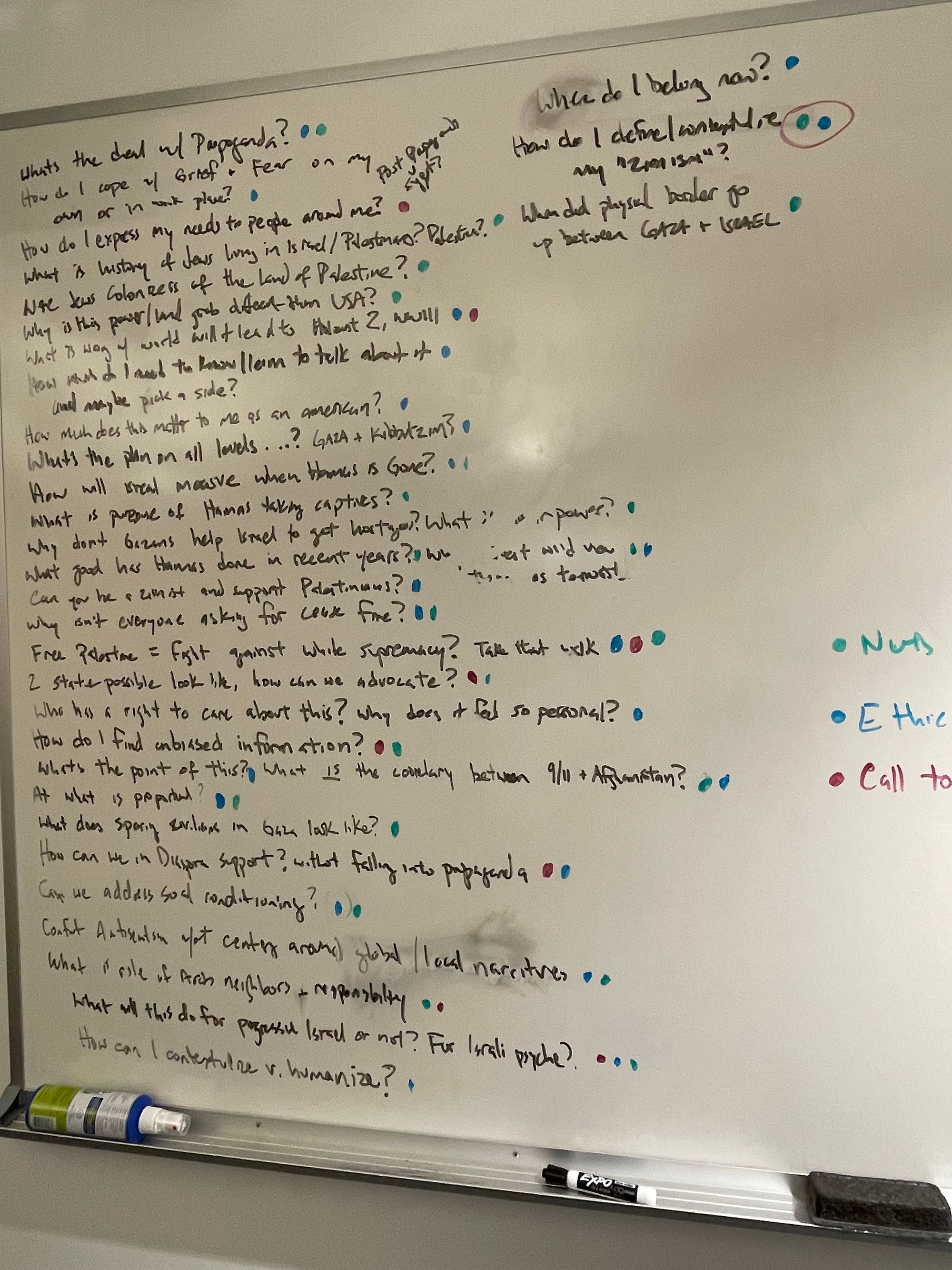 The conversations are designed to help participants articulate and develop better questions as they grapple with practical fears, ethical tensions, knowledge-gaps around the history of Israel and Palestine, and the madness of propaganda on social media. The conversations are organized into three parts.