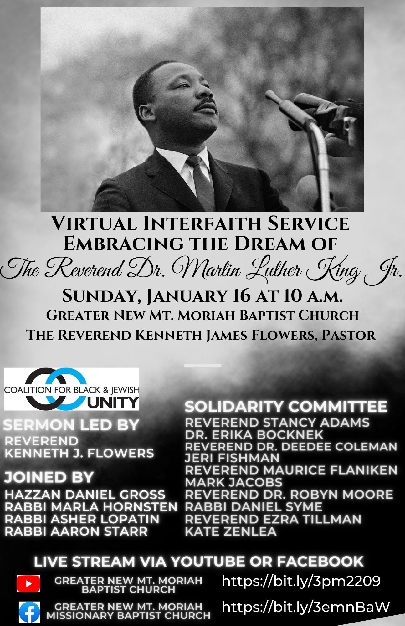 Please join the Greater New Mt. Moriah Missionary Baptist Church and the Coalition for Black and Jewish Unity for an interfaith service embracing the dream of the Reverend Dr. Martin Luther King Jr. The sermon will be led by the Reverend Kenneth James Flowers of Greater New Mt. Moriah, with guest speakers from the Coalition for Black and Jewish Unity. Tune in via youtube or facebook.