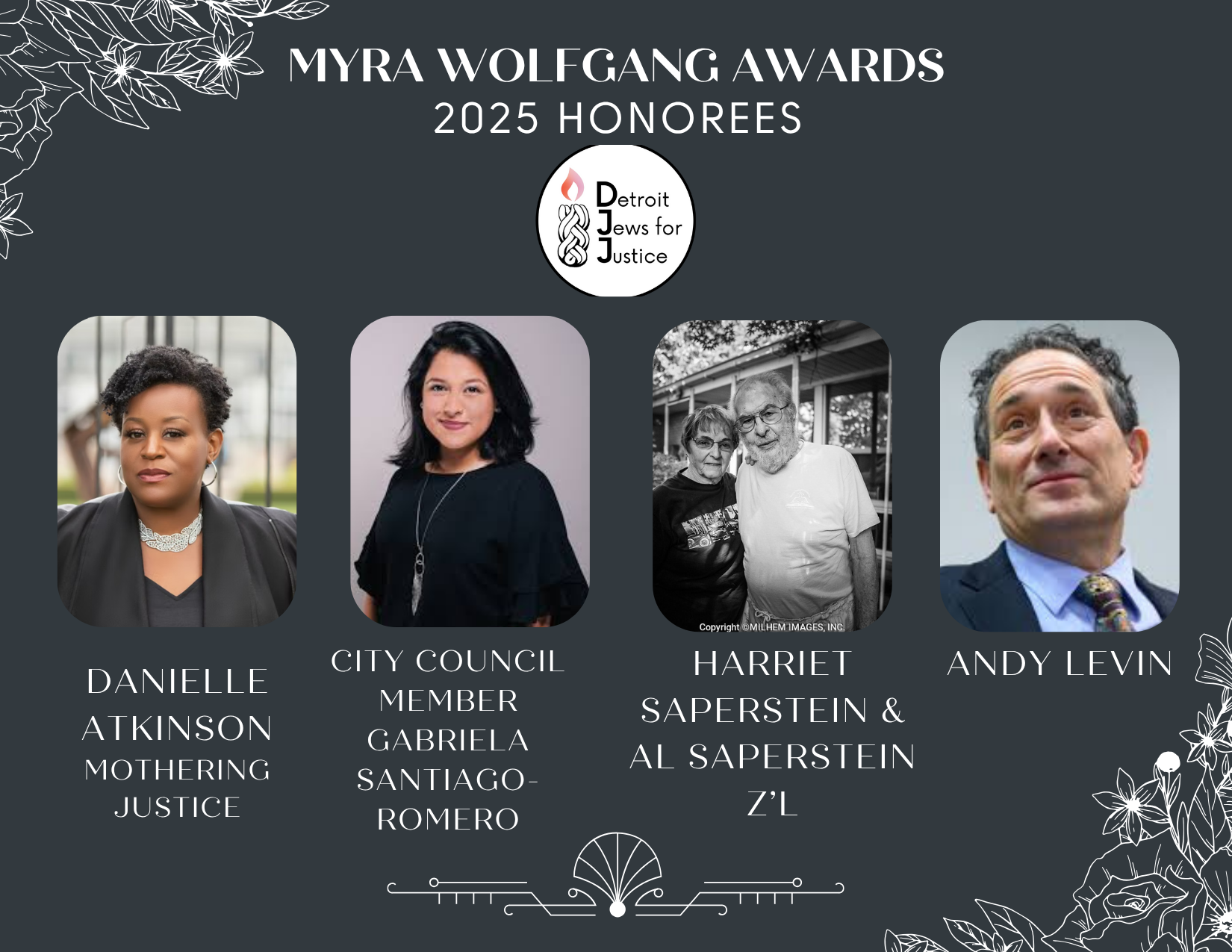On September 11, 2025, at the Imani Humphrey Banquet Hall at the Detroit People’s Food Co-Op in Detroit, Detroit Jews for Justice will host their 4th ever Myra Wolfgang Awards Gala, celebrating the accomplishments of local movement leaders, activists, and organizations fighting for racial and economic justice at the intersections of the progressive and Jewish communities.