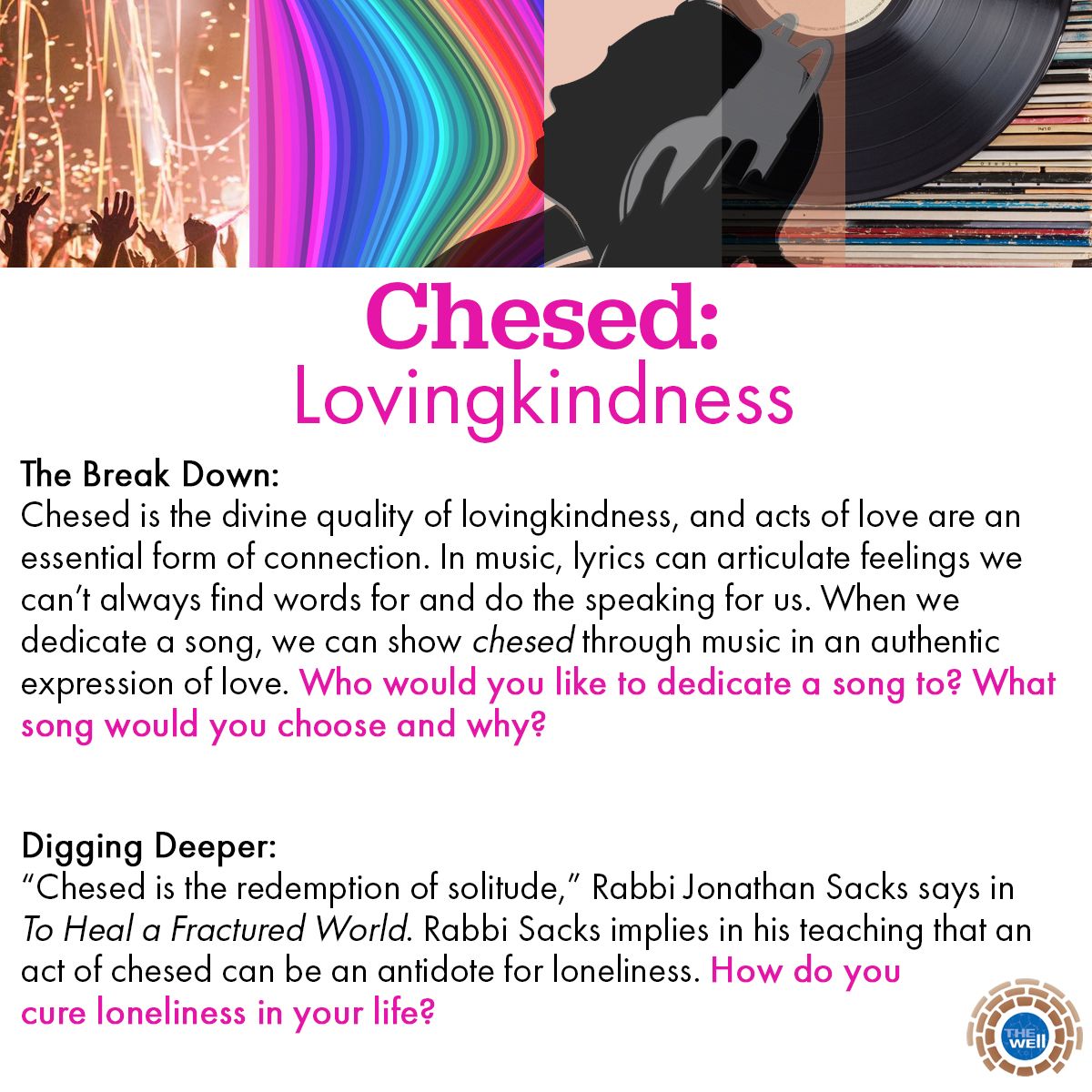 “Chesed is the redemption of solitude,” Rabbi Jonathan Sacks says in To Heal a Fractured World. Rabbi Sacks implies in his teaching that an act of chesed can be an antidote for loneliness. How do you cure loneliness in your life?