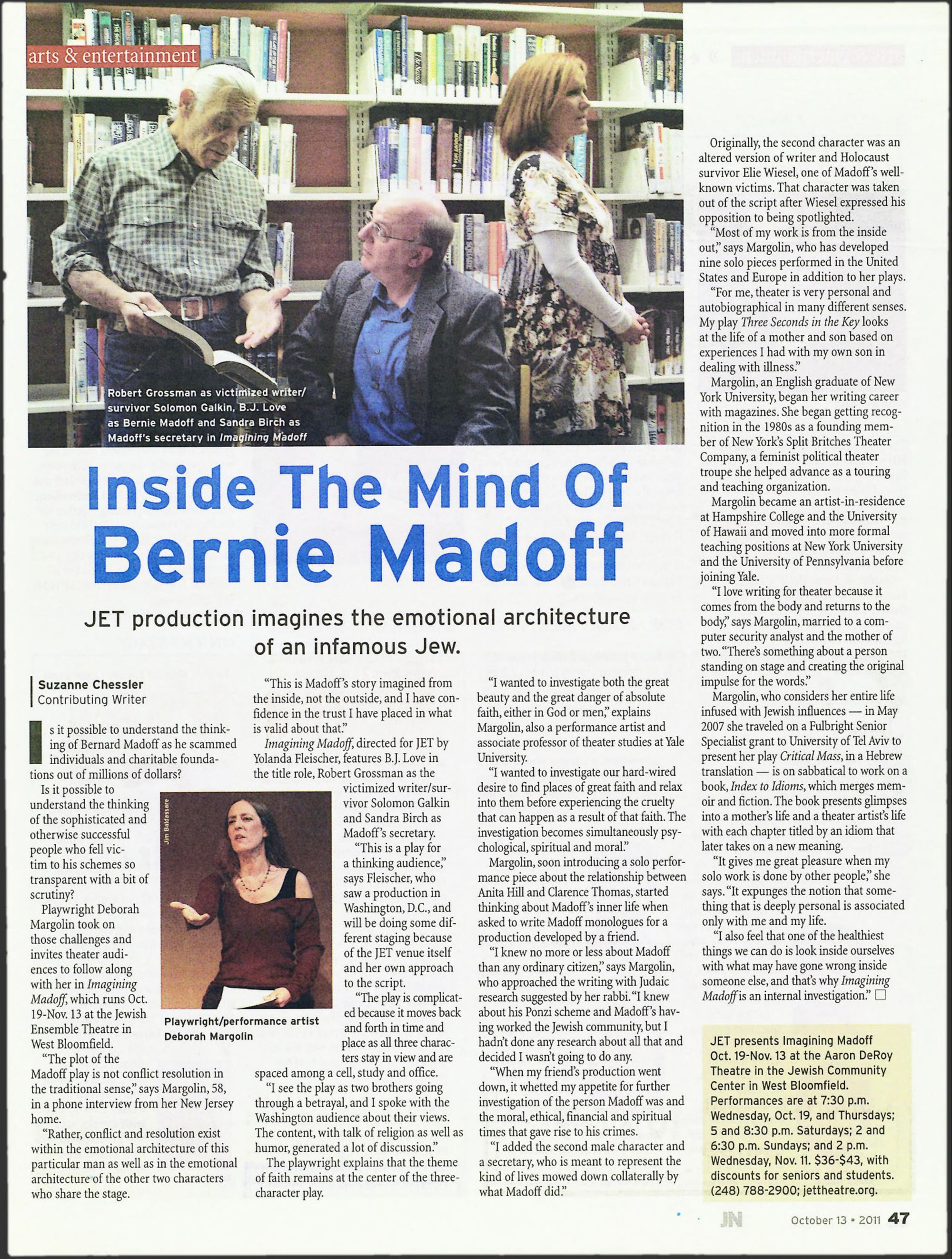 In 2011, the Jewish Ensemble Theatre brought Madoff to the stage in a local production of Deborah Margolin’s Imagining Madoff. In the original script, character opposite Madoff was a fictionalized rendition of real-life victim Elie Weisel, but Margolin changed it at his request.