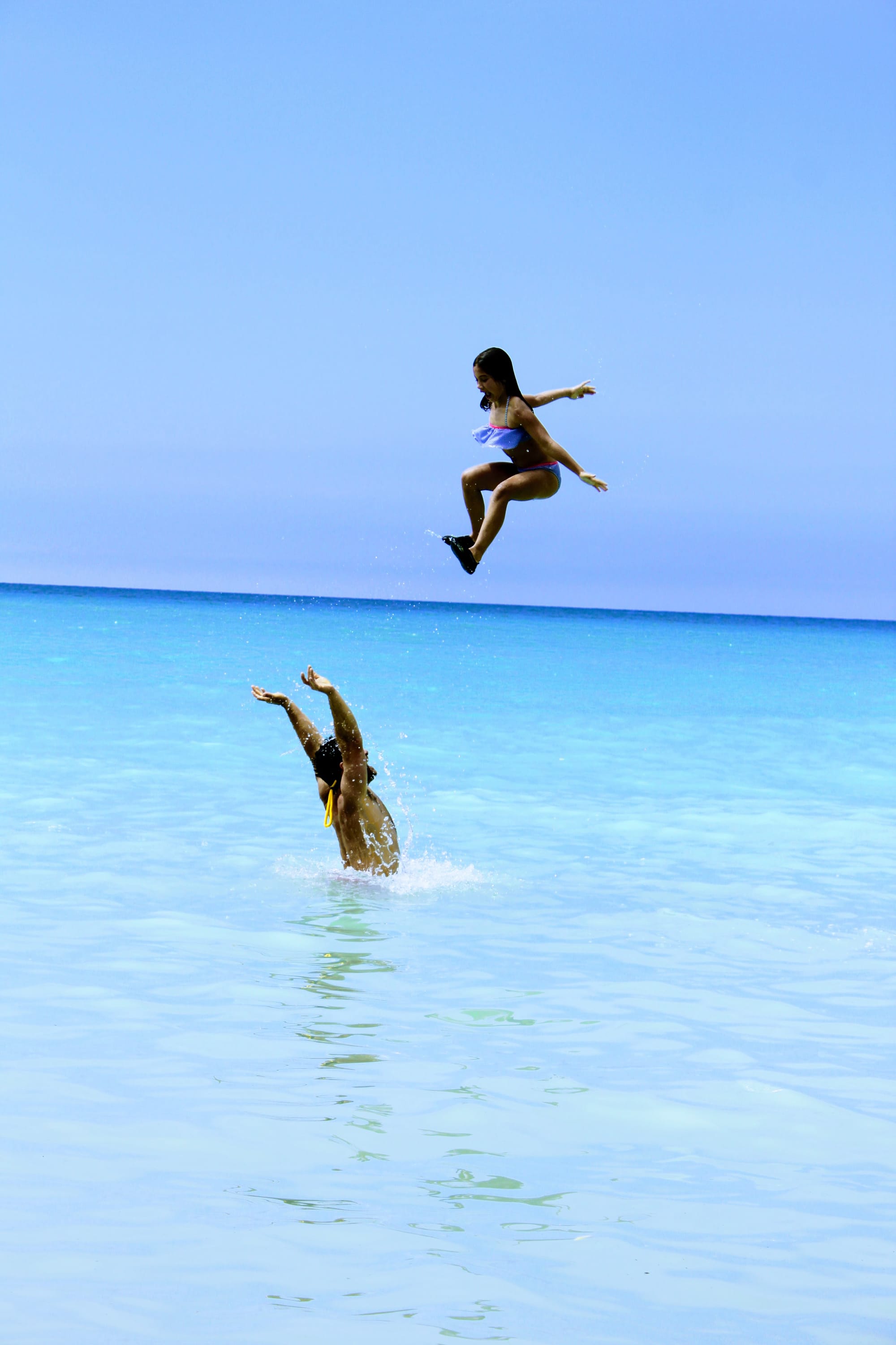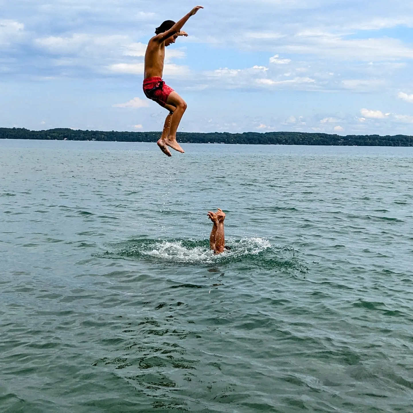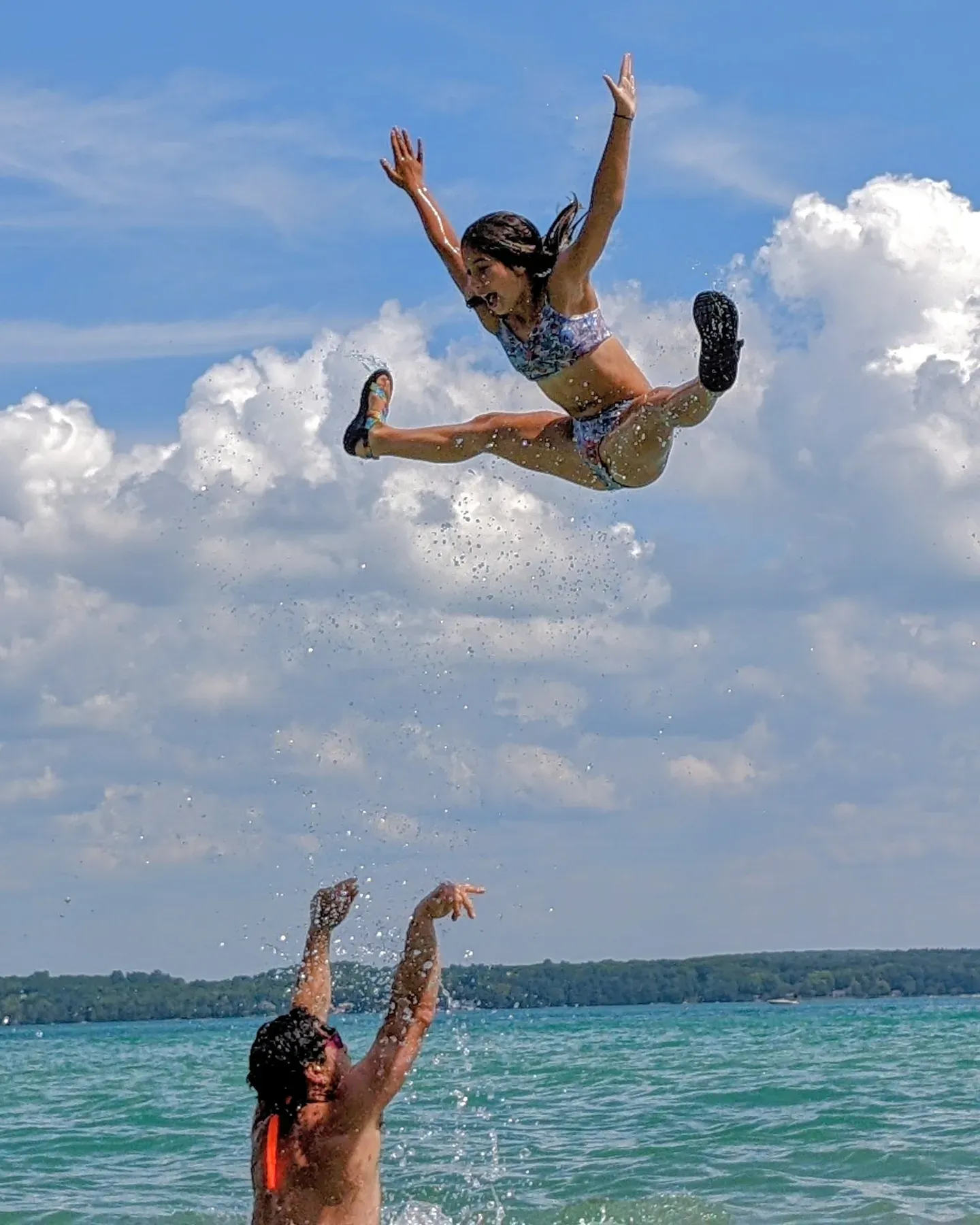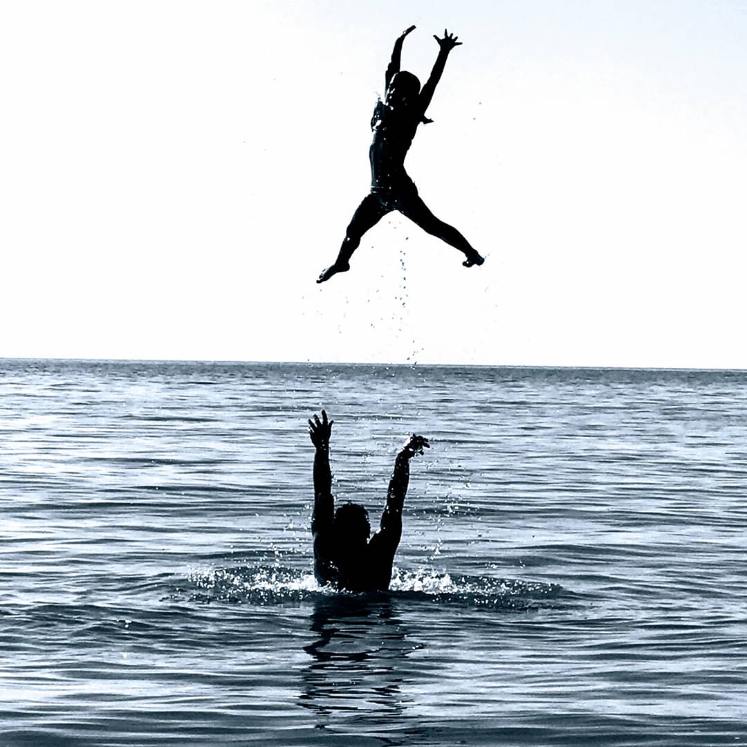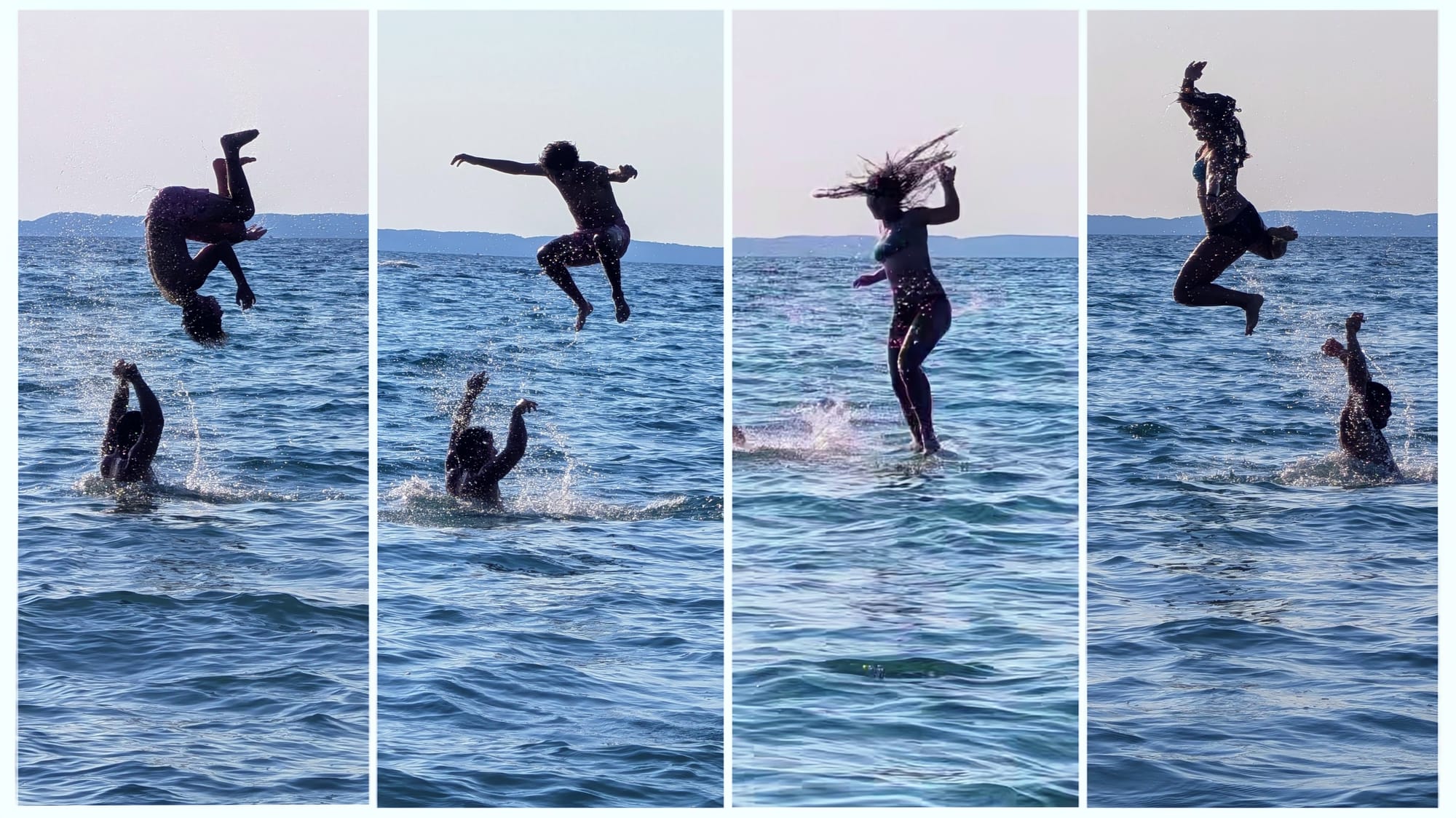But how much to push? Too much thrust and they could lose their footing, their equilibrium; too little and they might not break the surface. The answer is not in a book. And if you have two kids, you will have two different lifts, two different trajectories. One will flip and the other will twist and it will be disorienting for you but intuitive for them.